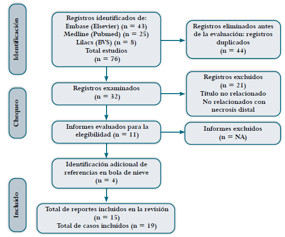 Dos autores (JU y SG) llevaron a cabo de manera independiente la revisión de todos los títulos y resúmenes, eligiendo aquellos que cumplían con los criterios de inclusión. No hubo discrepancias durante este proceso. La información general de los estudios fue recopilada por los mismos dos autores y registrada en un formulario diseñado específicamente para este propósito, incluyendo los siguientes datos: año, idioma, país, edad, sexo, tipo de cáncer, ubicación de la necrosis distal, dosis de gemcitabina que induce isquemia o necrosis, tratamientos. Desenlaces: resolución de isquemia, definida como restauración adecuada del flujo sanguíneo en las áreas afectadas, especialmente en las extremidades distales como los dedos de las manos o los pies 11; amputación de dedo 12,13 y muerte. La calidad metodológica de los artículos fue evaluada de manera independiente y por pares utilizando la herramienta de evaluación crítica del Joanna Briggs Institute para reporte de caso 14. Los resultados de la revisión sistemática se presentaron cualitativamente a través de una síntesis narrativa y tablas de resumen. Los datos cuantitativos se resumieron utilizando estadísticas descriptivas. El informe general de la revisión sistemática de la literatura sigue las recomendaciones de la declaración Prisma 15 y el reporte de caso sigue los estándares de la declaración Strobe 16.