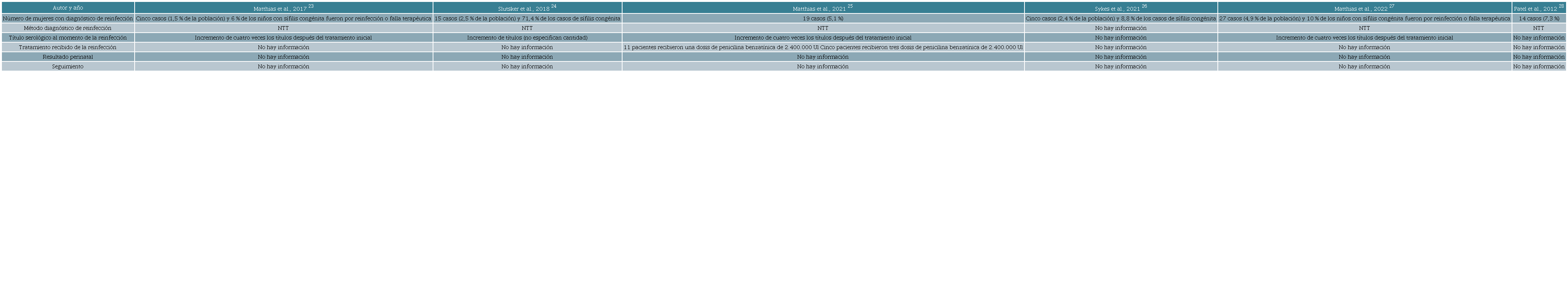 Reinfección por sífilis durante la gestación y sífilis congénita. En relación con la reinfección, se identificaron entre 5 y 27 casos por cada estudio, para un total de 85 mujeres con este diagnóstico (3,84 %). La incidencia osciló entre el 1,5 y el 7,3 %. En tres estudios (50 %) el criterio para establecer el diagnóstico de reinfección fue un aumento de al menos cuatro títulos en la prueba NTT, después del tratamiento inicial para la SG 23,25,27; en uno de ellos, el criterio fue presentar cualquier aumento 24, y en los estudios restantes no se definió claramente un criterio 26,28 (Tabla 2). Solo un estudio reportó el tratamiento recibido por las mujeres con reinfección (16,6 %) 25, donde 11 pacientes recibieron una única dosis de BPG de 2.400.000 unidades, y cinco pacientes recibieron tres dosis 25. Finalmente, ningún estudio incluyó información acerca del seguimiento materno, los resultados perinatales o la falla del tratamiento posterior a la reinfección.
