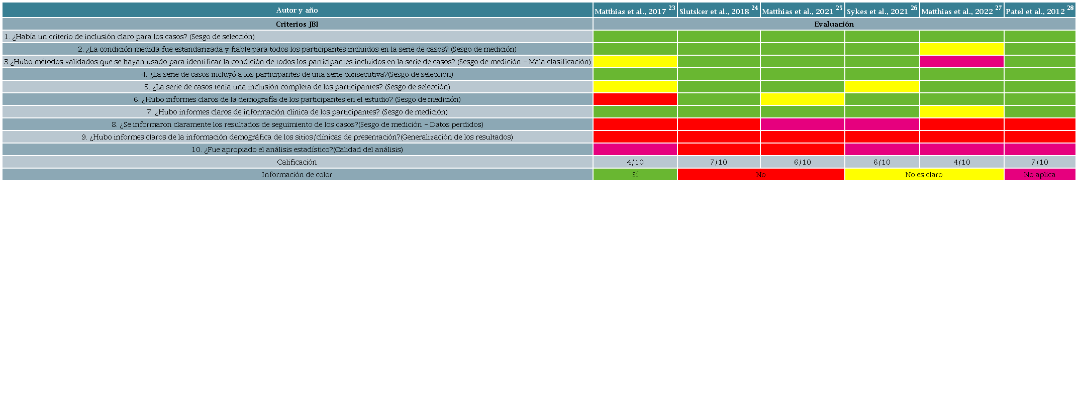 Evaluación de la calidad. Los estudios incluidos fueron evaluados de forma independiente por dos de los autores utilizando la herramienta del Joanna Briggs Institute 22. Se calificaron en riesgos de sesgos de selección (ítems 1, 4, 5), sesgos de medición (ítems, 2, 3, 6, 7), generalización de resultados (ítem 8) y calidad del análisis (ítem 9).