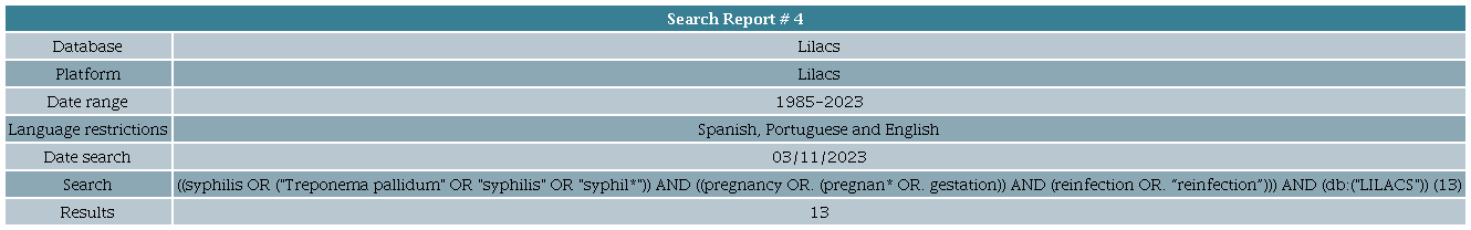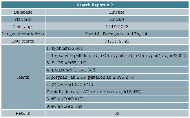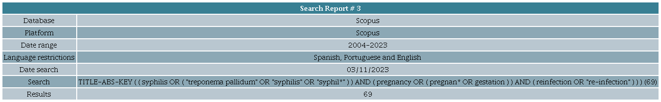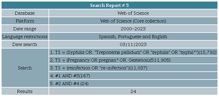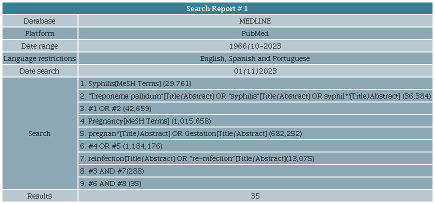 Se llevó a cabo una búsqueda sistemática en las bases de datos Medline vía PubMed, Embase, Scopus, Web of Science y Lilacs. Los términos de búsqueda indexados y relevantes fueron: “Syphilis”, "Treponema pallidum", “Pregnancy” y “Reinfection”. Se realizaron búsquedas adicionales en Google Scholar y Open Grey (Material suplementario 1). Además, se llevaron a cabo búsquedas con el método de bola de nieve a partir de las referencias de los estudios identificados, limitando la información a los documentos en español, inglés y portugués desde el inicio de registro de cada base de datos hasta el primero de noviembre de 2023.