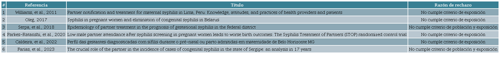 Resultados: Se identificaron 208 títulos potencialmente relevantes, de los cuales 12 fueron evaluados en texto completo. Finalmente, se incluyeron seis artículos. En total, 85 mujeres presentaron una reinfección por sífilis durante la gestación (3,8 %). La incidencia de reinfección por sífilis durante el embarazo varía entre el 1,5 y 7,3 %. El diagnóstico se realizó en mayor medida con pruebas no treponémicas (83,3 %). La información disponible respecto al tratamiento de la gestante con reinfección, el seguimiento, el tratamiento del compañero y los resultados perinatales es limitada.