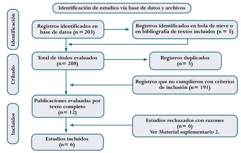Búsqueda y selección de los estudios. Durante la búsqueda se identificaron 203 estudios potencialmente relevantes, y otros cinco fueron seleccionados en la pesquisa de bola de nieve, para un total de 208 títulos (Figura 2). Luego de la revisión por título y resumen, se eliminaron cinco estudios que estaban duplicados y otros 191 que no cumplían los criterios de inclusión. Doce estudios fueron evaluados en texto completo, pero seis no cumplían los criterios de inclusión por lo que fueron descartados (Material suplementario 2). Finalmente, se incluyeron seis estudios para el análisis de la información.