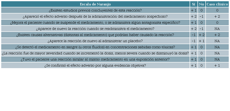 Para el caso reportado, el análisis de causalidad en reportes clínicos relacionados con reacciones adversas medicamentosas sugiere el uso de algoritmos estandarizados para su evaluación, como la escala de Naranjo (Tabla 2), que permiten establecer diferentes niveles de relación causa-efecto con una escala que tiene 13 ítems. Un valor de 9 a 13 indica asociación definitiva; de 5 a 8 probable asociación, y de 1 a 4 posible asociación 12. La aplicación de la escala para este caso mostró un puntaje de 5 puntos dado por la presencia de temporalidad debido a la colocación del anticonceptivo un mes antes del crecimiento mamario anormal (+2); la ausencia de causas alternativas que habrían podido generar el crecimiento (+2) y el evento adverso fue confirmado por evidencia objetiva (+1); lo que da una calificación de probablemente asociado. En contra de la causalidad tenemos que el proceso no revirtió cuando se retiró el implante. Los otros criterios no pueden ser evaluados.