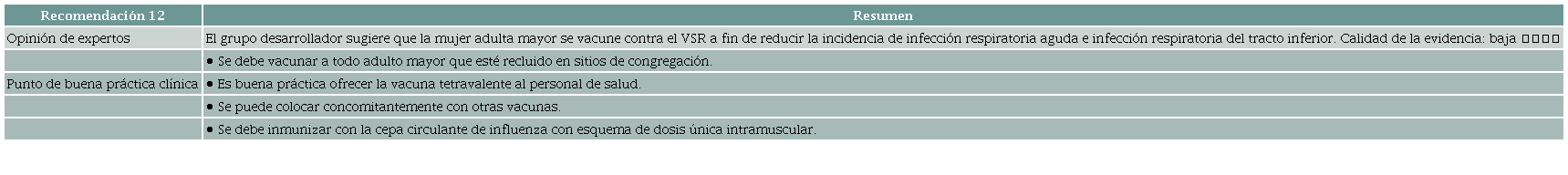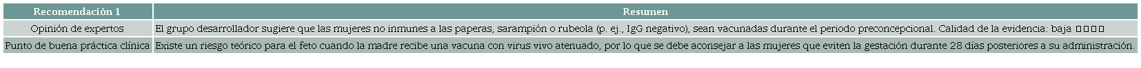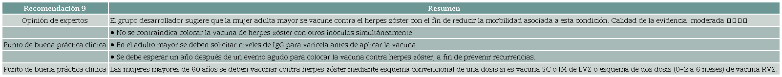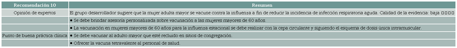 Resultados: Se desarrollaron las siguientes recomendaciones: 1. El grupo desarrollador sugiere que las mujeres no inmunes a las paperas, sarampión o rubeola (p. ej., IgG negativo) sean vacunadas durante el periodo preconcepcional. Calidad de la evidencia: baja ⨁⨁◯◯ 2. El grupo desarrollador sugiere que todas las mujeres en periodo preconcepcional se vacunen contra la varicela si no tienen inmunidad natural confirmada (p. ej., anticuerpos IgG negativo para el virus varicela zóster). Calidad de la evidencia: muy baja ⨁◯◯◯ 3. El grupo desarrollador sugiere que las mujeres que viven en regiones endémicas para fiebre amarilla se vacunen durante el periodo preconcepcional si no han sido previamente inmunizadas. Calidad de la evidencia: muy baja ⨁◯◯◯ 4. El grupo desarrollador sugiere vacunar adolescentes y adultas jóvenes con la vacuna para el virus del papiloma humano (VPH), de 3 dosis (0,2 y 6 meses) con el fin de reducir la incidencia y mortalidad por cáncer cervical. Calidad de evidencia: moderada ⨁⨁⨁◯ 5. El grupo desarrollador sugiere que las mujeres gestantes sean inmunizadas contra el tétano, la difteria y la tos ferina durante la gestación, con el objetivo de reducir el riesgo de infección en la madre y el neonato. Calidad de la evidencia: baja ⨁⨁◯◯ 6. El grupo desarrollador sugiere la vacunación contra la influenza a cualquier edad gestacional, con el objetivo de reducir el riesgo de infección en la madre y el neonato hasta los seis meses de edad. Calidad de la evidencia: muy baja ⨁◯◯◯ 7. El grupo desarrollador sugiere la vacunación materna frente al COVID-19 a cualquier edad gestacional, con el objetivo de reducir el riesgo de hospitalización y muerte de la madre y el neonato durante los primeros cuatro meses de vida. Calidad de la evidencia: muy baja ⨁◯◯◯ 8. El grupo desarrollador sugiere la vacunación contra el virus sincitial respiratorio (VSR) en mujeres gestantes, con el objetivo de reducir el riesgo de hospitalización en el neonato. Calidad de la evidencia: muy baja ⨁◯◯◯ 9. El grupo desarrollador sugiere que la mujer adulta mayor se vacune contra el herpes zóster, con el fin de reducir la morbilidad asociada a esta condición. Calidad de la evidencia: moderada ⨁⨁⨁◯ 10. El grupo desarrollador sugiere que la mujer adulta mayor se vacune contra la influenza a fin de reducir la incidencia de infección respiratoria aguda (IRA). Calidad de la evidencia: moderada ⨁⨁⨁◯ 11. El grupo desarrollador sugiere que la mujer adulta mayor se vacune contra el neumococo a fin de reducir la incidencia de neumonía y enfermedad neumocócica invasora. Calidad de la evidencia: baja ⨁⨁◯◯ 12. El grupo desarrollador sugiere que la mujer adulta mayor se vacune contra el VSR a fin de reducir la incidencia de infección respiratoria aguda e infección respiratoria del tracto inferior. Calidad de la evidencia: baja ⨁⨁◯◯ 13. El grupo desarrollador sugiere que la mujer adulta mayor que vive en regiones endémicas para fiebre amarilla se vacune si no ha sido previamente inmunizada. Calidad de la evidencia: muy baja ⨁◯◯◯