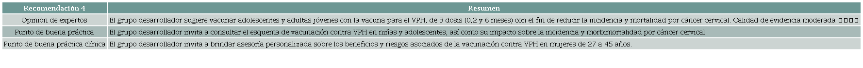 Conclusiones: Se recomienda la vacunación como estrategia de prevención primaria a lo largo de las diferentes etapas de la vida en la mujer. Dada la calidad de la evidencia y las serias limitaciones en la aplicabilidad de algunos estudios, especialmente en mujeres gestantes, se requieren más investigaciones que evalúen la seguridad y la efectividad de esta intervención en esta etapa de la vida.