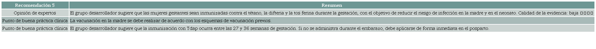 Una revisión sistemática que incluyó ensayos clínicos controlados y estudios cuasialeatorios 30 (AMSTAR 2: confianza alta) evaluó la seguridad y la efectividad de la vacunación contra el toxoide tetánico a lo largo de la gestación. La intervención consistió en administrar toxoide tetánico con fosfato de aluminio (10LF), toxoide tetánico- diftérico reducido o vacuna acelular contra tétanos, difteria y tos ferina (Tdap) en mujeres de 13 a 45 años, con edad gestacional comprendida entre las 30 y 32 semanas. El grupo control recibió placebo o no intervención. Evidencia de baja calidad sugiere que, cuando se compara frente al grupo control, la administración de dos o tres dosis de vacuna quizás reduce la mortalidad por tétanos neonatal (RR = 0,02; IC 95 %: 0,01-0,03), la mortalidad por cualquier causa en el periodo neonatal temprano (RR = 0,31; IC 95 %: 0,17-0,55) y la incidencia de tétano neonatal (RR = 0,20; IC 95 %: 0,10-0,40), a expensas de una mayor frecuencia de dolor en el sitio de aplicación (RR = 5,68; IC 95 %: 1,5420,94). La calidad de la evidencia fue baja por limitaciones en el riesgo de sesgo y en la precisión de los resultados.