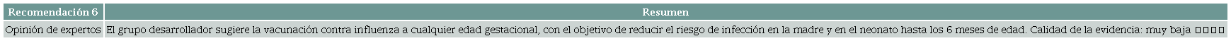 Una revisión sistemática desarrollada a partir de ensayos clínicos controlados y estudios no aleatorios con grupo control 32 (AMSTAR 2: confianza baja) evaluó la seguridad y la efectividad de la vacunación contra la influenza durante la gestación. La intervención consistió en administrar vacuna trivalente contra la influenza, acompañada o no de vacuna monovalente contra la influenza pandémica H1N1, en tanto que el grupo control recibió placebo o no intervención. Evidencia de muy baja calidad sugiere que, cuando se compara frente al grupo control, la administración de vacuna contra la influenza puede reducir la incidencia de episodios confirmados de infección (RR = 0,47; IC 95 %: 0,31-0,71), sin diferencia aparente en la frecuencia de síntomas similares a la influenza (RR = 0,95; IC 95 %: 0,88-1,00) o en los episodios de infección respiratoria (RR = 0,81; IC 95 %: 0,55-1,20), pero la evidencia es incierta. Cuando la intervención se acompañó de vacuna monovalente contra la influenza pandémica H1N1, se observó una menor proporción de pacientes con episodios confirmados de infección por influenza (RR = 0,30; IC 95 %: 0,26-0,35) y de síntomas similares a la influenza (RR = 0,15; IC 95 %: 0,06-0,36). La calidad de la evidencia fue muy baja por limitaciones en el riesgo de sesgo, la precisión y la heterogeneidad de los resultados.