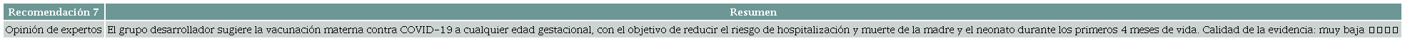 Otra revisión sistemática, desarrollada con estudios no aleatorios con grupo control 35 (AMSTAR 2: confianza baja), evaluó la seguridad de la vacunación contra COVID-19 para la madre y el feto. La intervención consistió en administrar vacuna a base de partículas ARNm y vacunas de ARNm acompañadas de vector inactivado en gestantes independientemente de la edad gestacional. Evidencia de muy baja calidad sugiere que, cuando se compara frente al grupo control, la administración de vacuna contra COVID-19 podría o no incrementar la frecuencia de trastornos hipertensivos asociados a la gestación (OR = 1,07; IC 95 %: 0,78-1,45), aborto (OR = 1,13; IC 95 %: 0,58-2,17), cesárea (OR = 1,10; IC 95 %: 0,95-1,27), hemorragia posparto (OR = 0,88; IC 95 %: 0,77-1,01), parto pretérmino (OR = 1,00; IC 95 %: 0,95-1,06), APGAR bajo (OR = 0,94; IC 95 %: 0,86-1,04) u óbito (OR = 1,02; IC 95 %: 0,82-1,26), pero la evidencia es incierta. La administración de la vacuna para COVID-19 puede reducir la incidencia de infección confirmada (OR = 0,56; IC 95 %: 0,47-0,67) y hospitalización por COVID-19 (OR = 0,50; IC 95 %: 0,31-0,82), sin diferencia aparente en la proporción de pacientes que ingresaron a UCI por esta entidad (OR = 1,29; IC 95 %: 0,23-7,24), pero la evidencia es incierta. La calidad de la evidencia fue muy baja por limitaciones en el riesgo de sesgo, la precisión y la heterogeneidad de los resultados.