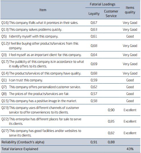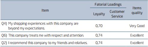 The reliability of the scale was calculated using Cronbach's alpha index, which was 0.91 for the factor "Loyalty"and 0.88 for the factor "Customer Service", which means high reliability or precision (Nunnally & Bersntein, 2006). The total variance explained reached near 50%, so being satisfactory, according to Hair et al. (2009).