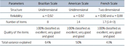 We compared the scales validated in France, Brazil and the USA by analyzing the fit indices through psychometric analyses. In relation to the exploratory factor analysis, we analyzed the reliability of the scales, as well as the number of items, validity (quality of the items) and the total variance explained for each one, as illustrated in Table 3.