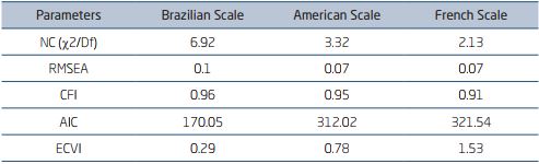 As far as the confirmatory factor analysis is concerned, the scales were compared in terms of NC (X2/df), RMSEA, CFI, AIC (Akaike Information Criterion), and ECVI (Expected Cross-Validation Index). The two two mentioned adjustment indices were used considering that the statistic of χ2 affects complex models (multifactorial), as highlighted Marôco (2010), which might have been the case in this study. Still, in accordance with this author's opinion, the best model is the one which has the least value for AIC and particularly for ECVI. The comparison among the three scales can be seen starting from Table 4.