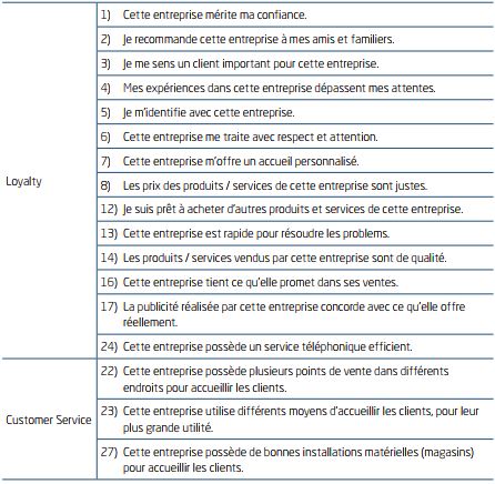 Summary of key results: The results obtained in the analyses allow us to conclude that the relation between clients and companies is really two-dimensional and it involves two distinct factors, namely Loyalty and Customer Service. The scale validated in Brazil and in the United States remained stable, in terms of validity (quality of items) and reliability, when validated in a distinct context, that is, France. This makes its application in French organizations possible, improving its external validity and generalization.