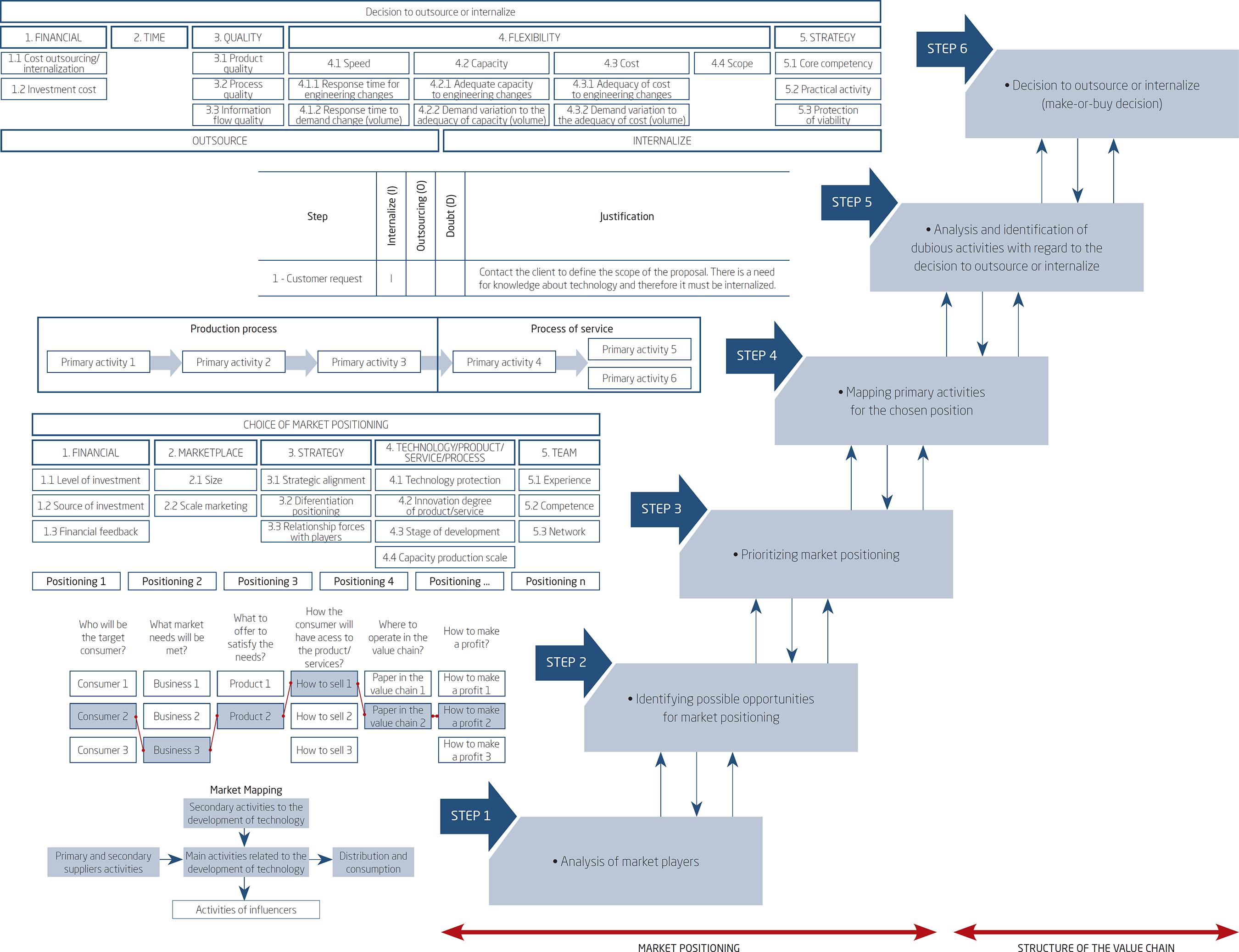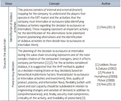 Analyzing these Brazilian studies, and in relation to the choice of market positioning, Reis (2013) declared that it was not possible to find in the literature a reference model that could guide an entrepreneurial team and at the same time assist it in the decision-making process. Regarding value chain structuring directed by the decision to outsource or internalize activities, the literature has been rich and has used various decision-making models (McIvor, Humphreys, & McAleer, 1997; Momme & Hvolby, 2002; Moses & Åhlström, 2009; Platts, Probert, & Cáñez, 2002; Van de Water & Van de Peet, 2006; Zhu, Hsu, & Lillie, 2001). Despite contributing to the literary framework, these models demonstrate certain limitations. It should be pointed out that the models, according to Moses and Åhlström (2008) are a) deductive and supported by idealized scenarios, without empirical support, and do not correspond to the way in which companies actually make their decisions; and b) are static and do not reflect organizational dynamics and complex decision-making processes.