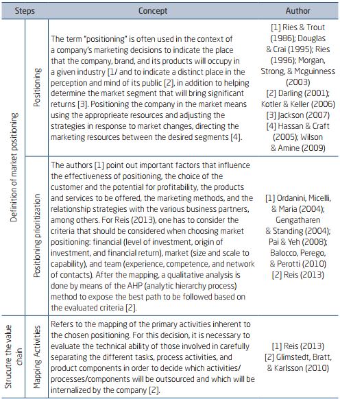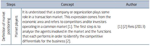 From the structure of the six-step process, the present study proposed modifications, specifically in step 2, focusing on the identification of possible positioning opportunities. Initially, five constructs (Reis, Ladeira, & Fernandes, 2015) oriented the identification of the following positions: 1. target consumers; 2. market needs to be met; 3. products and services to be offered; 4. marketing channels to be explored; and 5. ways of making a profit.