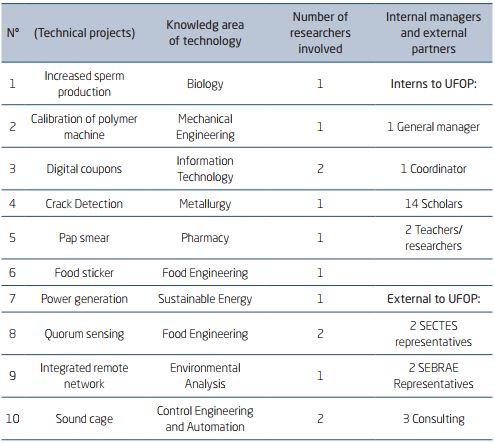 The meetings via Skype® occurred weekly and lasted approximately 90 minutes each time. This activity lasted nine months, covering the period from July 2015 to March 2016. This was the best moment to collect the inputs needed for the next step. During this phase, documents also had to be consulted (e.g., feasibility studies on technical, economic, commercial, and environmental impact; business plans; and reports of the IIP management team; among others). A total of 14 undergraduate and master's degree students, two research professors, four professionals from funding agencies of the program (two from SEBRAE and two from SECTES), an institutional manager of UFOP, and a coordinator of the program in UFOP took part. Thus, 38 professionals were involved (see Table 2). The selection of the respondents took into consideration their knowledge about the business, knowledge about the program, relevance of the program to the context of innovation in the state of Minas Gerais, and the program's importance to UFOP. The interviews provided a greater understanding of the technology, products, and technological projects market, and clarified uncertainties related to the business. For each of the projects listed in Table 2, the strategy sought by the researchers-entrepreneurs for the generation of technological business was identified; namely, if they were more likely to undertake or transfer the technology. At the end of this study, it was found that of the 10 cases, five chose to transfer and the other five chose to proceed.