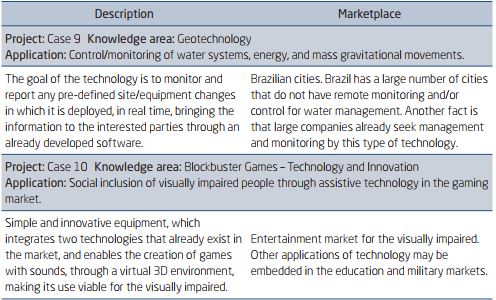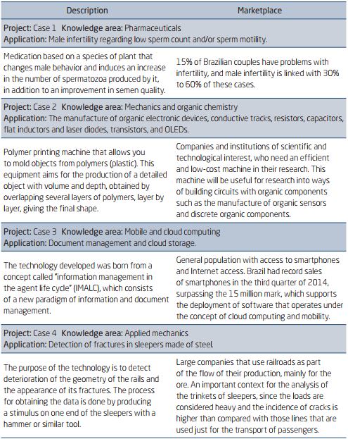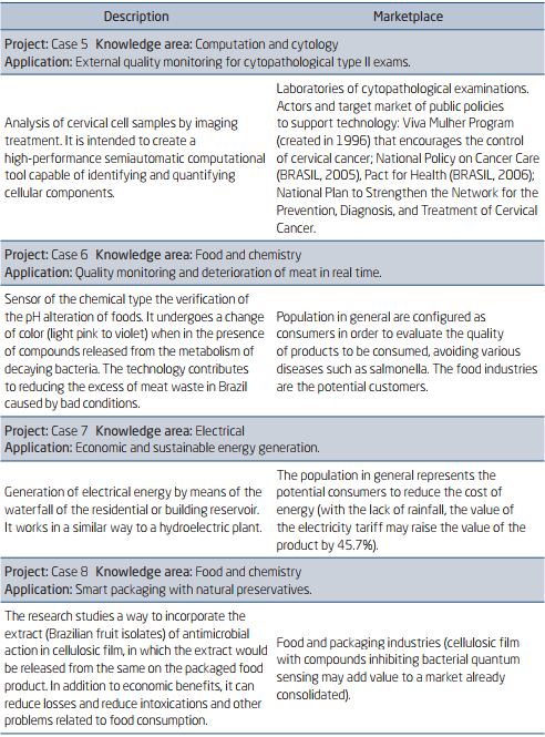 In order to detail the projects studied, Table 3 was constructed. This table contains a brief description of the projects and the profiles of the markets. Cases 1 and 5 are focused on the pharmaceutical area. The first focuses on the development of a drug that seeks to increase the number and quality of male reproductive cells; other case considers the development of software that increases the quality of cytological analysis. Cases 2, 4, 7, and 9 focus on the mechanical area, with the development of machines capable of optimizing processes, generating energy, and monitoring possible nonconformities. Cases 6 and 8 are aimed at the food industry in order to contribute to the quality and monitoring of food.