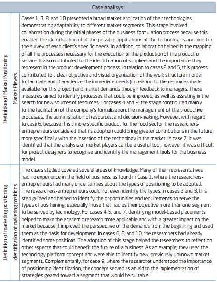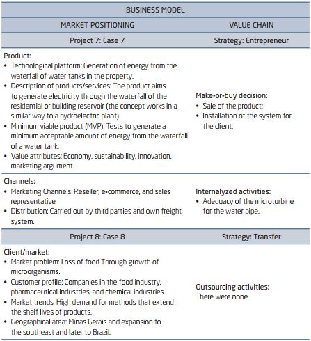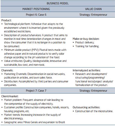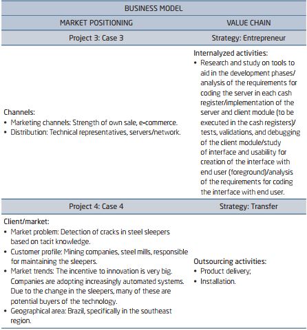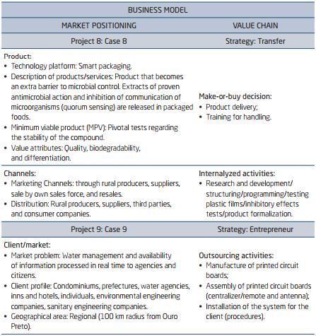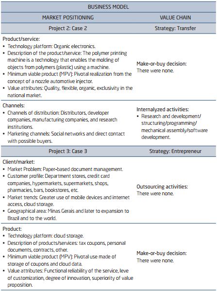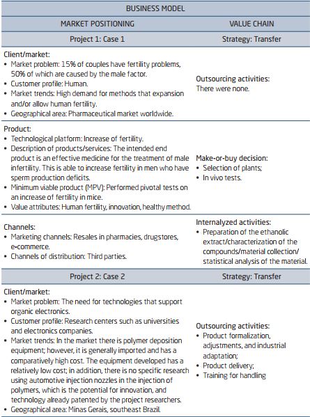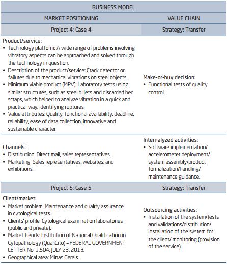 In order to characterize each product and explain the strategy adopted by the researchers on the decision to undertake or transfer, Table 4 was elaborated. In the process of analyzing each case, we tried to adopt a logic that would help the researchers-entrepreneurs to characterize market positioning and the projects' value chain.