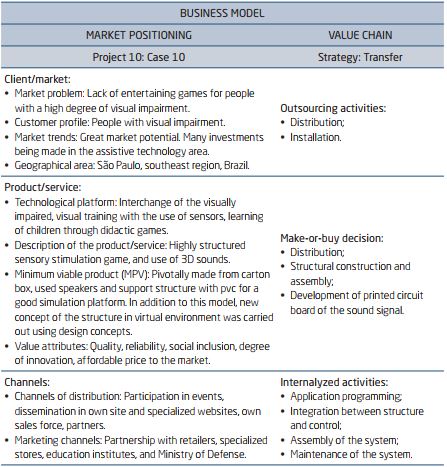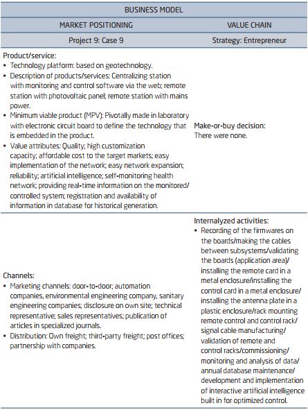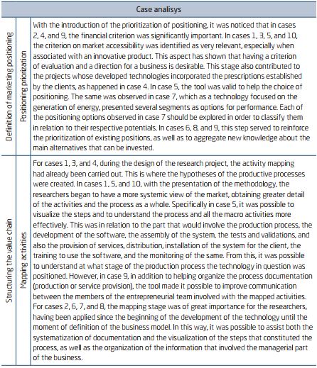 With regard to the business planning process, the focus was on three points: i) structuring the company, ii) market positioning, and iii) identifying the type of competition strategy to be adopted by the project (namely, competing for cost or differentiation). At this point, it could be seen that the strategy adopted in the project directly influenced the process of planning and the transfer of technology (mainly in the patenting phase), since recipient companies (companies that benefit from the exploitation of technology) demand guarantees about the technology they acquire. It can be seen from case 4 that the use of MVP was seen as a way of performing interventions in the model before idealizing the prototype, thereby helping to relate to the client.