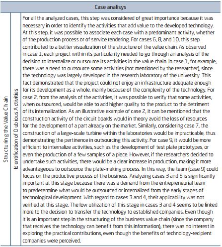 Regarding the methodological strategy, it was possible to construct a table demonstrating the characteristics of each case based on the elaborated frameworks, the data collected, and the codification of the information for each data collection instrument. The existence of regularities between the characteristics were then identified. From this, it was possible to obtain clear, convergent, and divergent patterns among the observed cases because it was possible to validate initially established propositions and/or complement them.