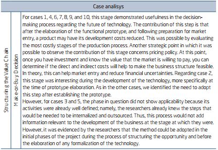 The decision to outsource or internalize activities became important during the consolidation of marketing practices and pricing policy. This step helped in the process of defining the costs associated with technological development. Its importance was evidenced when there were already studies of product consolidation and business viability, which was highlighted again by the researcher in cases 6 and 8: