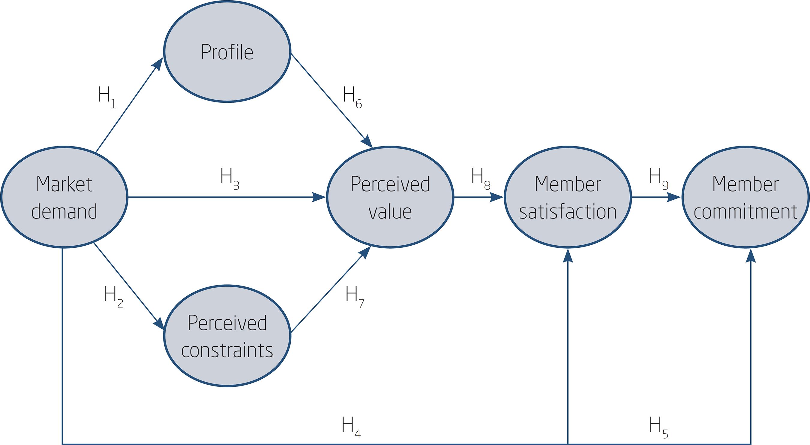 In the original study (Kim, 2010), the author confirmed support for all hypotheses, other than H7. However, in this study, we did not find support for hypotheses H2 or H7, which predict a negative impact by market demand on restrictions, and a negative impact by restrictions on value, respectively. Both hypotheses relate perceived constraints to market demand and value perception. The theory states that market demand explains the variations in the perceived constraints and that this, in turn, influences the perception of value. In this study, however, the results show that the "perceived constraints" construct should not be used to explain perceptions of value and, consequently, participants' commitment and satisfaction.