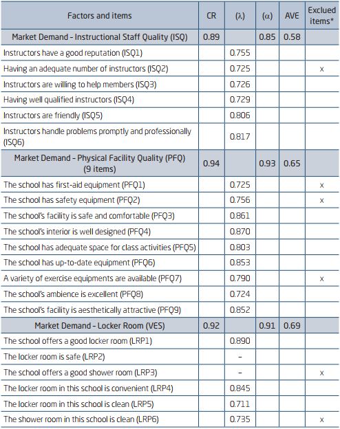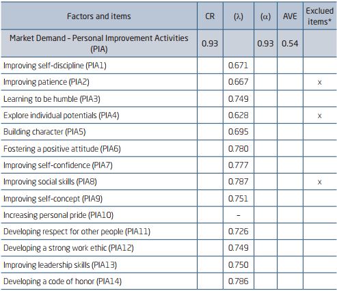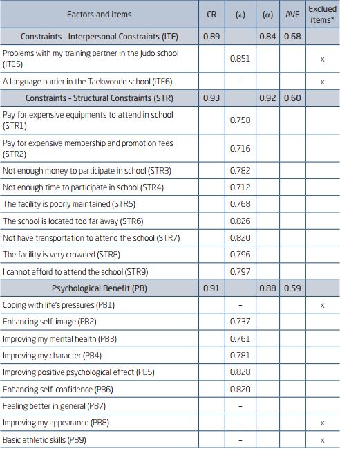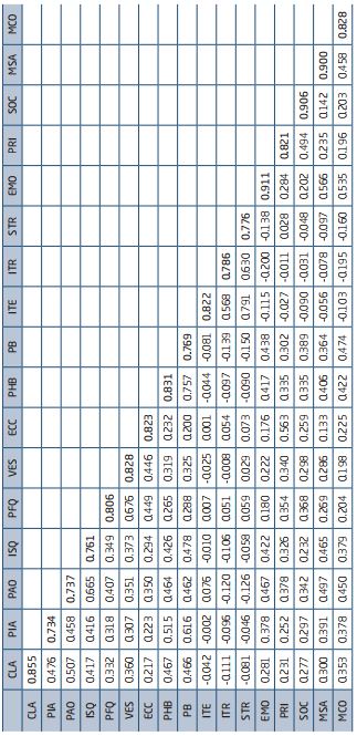 The evaluation of reliability, validity, and multicollinearity indicated that several items should be excluded because they present a very low load. Thus, of the 114 indicators, 27 were excluded, as shown in Table 1. The results show that in the general measurement model, the alpha coefficient (α) of the constructs and their latent factors showed a high level, ranging from 0.71 to 0.93. As recommended in the literature, convergent validity is obtained once the individual factor loads are all above 0.6, and the average variance extracted (AVE) figures from the constructs are above 0.50.