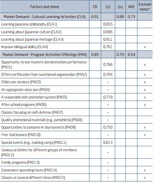 The constructs studied here are the same as those operationalized by Kim (2010). Therefore, the data collection instrument consists of 114 indicators (See Table 1), which measure the following: 1. market demand (62 items, divided into seven sub-factors); 2. perceived benefits (12 items, divided into two sub-factors); 3. perceived restrictions (22 items, divided into three sub-factors); 4. perceived value (11 items, divided into four sub-factors); 5. satisfaction (three items in a single factor); and 6. commitment (four items in a single factor). All are measured using a seven-point Likert Scale.