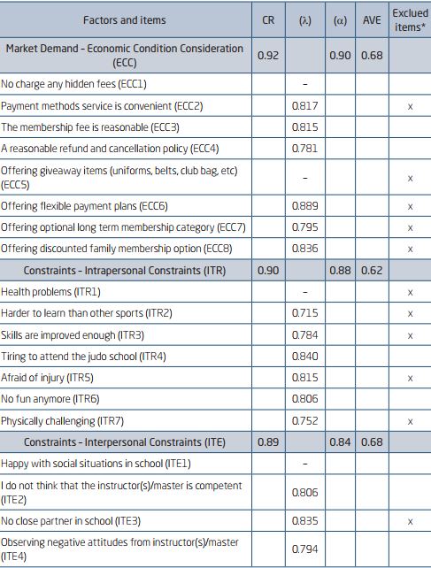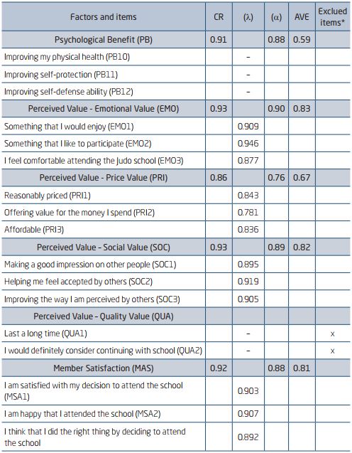 Next, data were collected from 355 judo members. The questionnaire was disseminated to training centers in several cities in Paraná (Brazilian state). Of the 355 completed questionnaires, 328 were considered valid, and showed the following characteristics: 75.6% are male; 49.1% are young people ranging from 18 to 26 years of age; 56.7% are single; 52.4% are graduate students; 61.4% receive a gross family monthly income over BRL 2,000.00; 64% attend a private training center; 62.5% have practiced judo for more than nine years; 43.3% have been practicing in the same training center for more than seven years; 94% attend gym at least twice a week; 80% spend between one and two hours per day where they practice the sport; 43% belong to an intermediate graduation (i.e., orange to brown belts); 78% found out about their training center through friends or acquaintances; and 66.2% spend up to BRL 1,200.00 on judo per year.