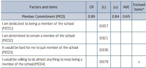 Compound reliability achieved rates over 0.70 in all constructs, proving that these are reliable measures. The alpha coefficients and the compound reliabilities of the constructs satisfaction and commitment were 0.88-0.93 and 0.84-0.90, respectively. The AVE was 0.81 for the satisfaction construct and 0.69 in the case of commitment.