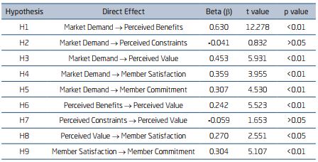 The data presented in Table 3 show that the latent variable, market demand, positively affects perceived benefits (β = 0.630; t = 12.278), perceived value (β = 0.453; t = 5.931), member satisfaction (β = 0.359; t = 3.955), and member commitment (β = 0.307; t = 4.530), in addition to having a negative impact on perceived restrictions (β = -0.041). However, the t-value is not statistically significant (t = 0.832; p > 0.05). Thus, in terms of market demand, hypotheses H1, H3, H4, and H5 are supported, while H2 is not.