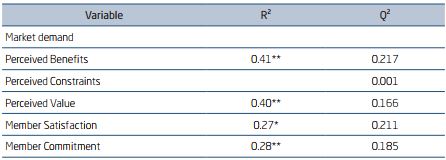 It was observed that the R2 values of the endogenous variables (i.e., benefits, value, satisfaction, and commitment) are weak, explaining between 27% and 41% of the variance (Hair et al., 2014). On the other hand, the R2 values of the exogenous variables showed greater consistency, ranging from 0.32 for the economic conditions of the market demand construct to 0.90 for the psychological benefits of the perceived benefits construct. The Q2 figures indicate predictive ability, because they were higher than 0 (zero). Nonetheless, because the figures were low, their predictive power is questionable (Hair et al., 2014), highlighting the need of further investigation. The factors with a higher predictive power come from the relationship between perceived restrictions and perceived benefits.
