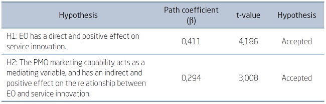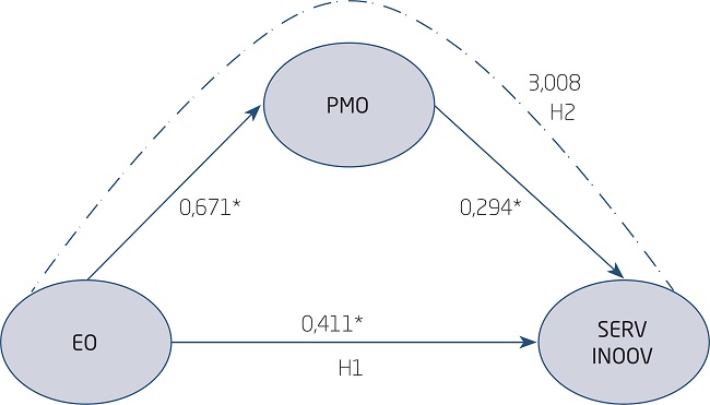 Source: Elaborated by the authors.Hypothesis 1 verified the relationship between EO and service innovation. The test of this hypothesis resulted in a path coefficient of 0.411, indicating an important relation between the two variables. The t value was 4.186 (> 1.96), showing the significance of the relationship at a confidence level of 95%, that is, p <0.05 (Hair Jr et al., 2014). This means that EO directly and positively affects service innovation. This result indicates the importance of EO in organizations, because EO is perceived as the processes, practices and activities that result in innovation. (Slater & Narver, 1993; Slater & Narver, 1995). These findings corroborate the results found by Salunke, Weerawardena, and McColl-Kennedy (2013) that service entrepreneurship contributes significantly to service innovation and is considered an important source of competitive advantage. Thus, it can be understood that EO contributes to innovation, since it is a strategic orientation that reflects the search for new opportunities, ideas and experiences, and that can be manifested in the form of innovation in products, services and processes (Miller, 1983; Covin & Slevin, 1991; Lumpkin & Dess, 1996; Wiklund & Shepherd, 2005).