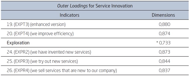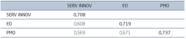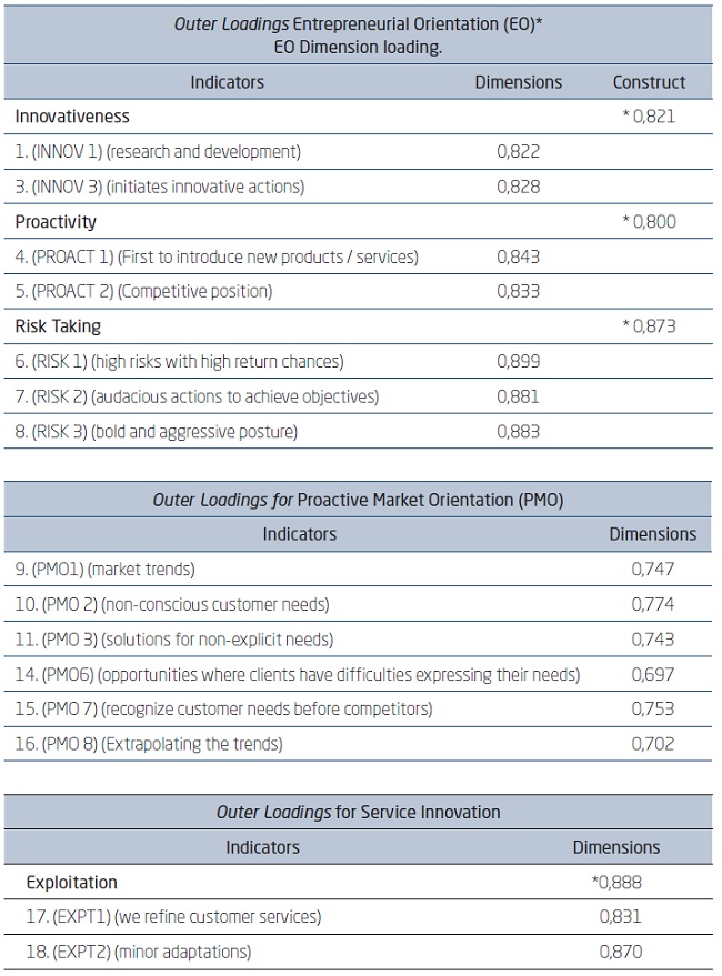 The exploratory factor analysis of each construct was performed in SPSS 1.8. and corroborated the theory. The EO construct carried in three factors with significant loadings (Appendix 1), that is, above 0.7 (Hair Jr et al., 2014). The construct dynamic marketing capability of PMO presented low commonality in two items, and, for that reason, another exploratory factor analysis was done excluding these two items, thus achieving satisfactory factor loadings. Finally, the service sinnovation loaded in two factors (exploration and exploitation - as predicted in the theory), with equally satisfactory factor loadings. However, in order to test the hypothesis in the SMART PLS 3.0 statistical software, we had to make some adjustments, removing five items of this scale.