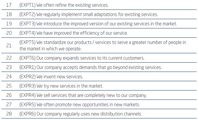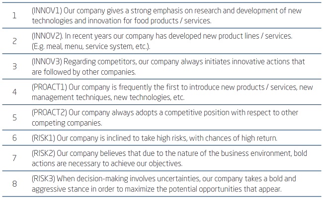 We used scales that were previously used in the literature to make our questionnaire. In order to measure the entrepreneurial orientation, the Miller (1983) scale was used, which was refined by Covin and Slevin (1989) and later by Baker and Sinkula (2009), since these authors are precursors of EO. The scale includes three dimensions: innovation, proactivity and propensity to take risk; and has eight items. The PMO dynamic capability was measured using the eight-item MOPRO scale developed by Narver et al. (2004). The service innovation construct was measured using the Jansen et al. (2006) scale with 12 indicators, considering the exploration and exploitation classification of innovation. The Entrepreneurial Orientation (EO) items are presented in Table 2.