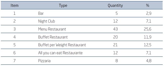 In the following table it is possible to verify the types of ventures according to Brazilian Association of Bars and Restaurants [ABRASEL]. Although the business ventures fall into more than one category, such as in some buffet restaurants that are also pizzerias, the case was classified according to its main activity.