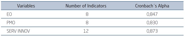 EO, PMO and service innovation constructs presented reliability with Cronbach’s alpha value above 0.8 (Hair Jr, Hult, Ringle, & Sarstedt, 2014). Table 6 presents the Cronbach’s Alpha of each scale used in this study, showing that all reached desirable levels of reliability.