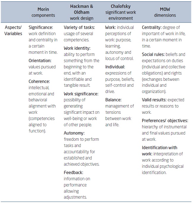 All models focus on labor values and aspects of the execution of the activity/work. Besides Chalofsky’s model that emphasizes the individual, all models include individual and organizational aspects. Hackman and Oldham’s model emphasizes the design and the exercise of the activity/function with a social and technical approach. It has been quoted and explored over the last 40 years. Chalofsky (2010) criticizes the organizational philosophy of result by result and the organizational and careers hierarchical model. Morin’s and MOW models tend to balance individual and organization and search for continuous interaction between the two. The use or support of one or another model depends on the type of study realized (objective, theoretical framework, and investigation method).