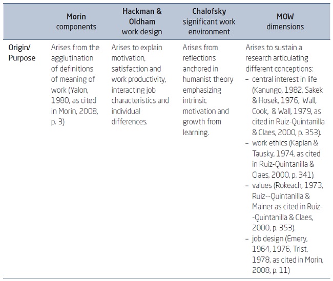 Theoretical models also conceptually deepen a construct and systematize the empirical research process. Despite the meaning of work being an individual representation, the existence of models reflects the possibility of shared interpretations of expectations on work on the organizational and social dimensions (Morin, Tonelli, & Pliopas, 2007; Ruiz-Quintanilla & Claes, 2000).