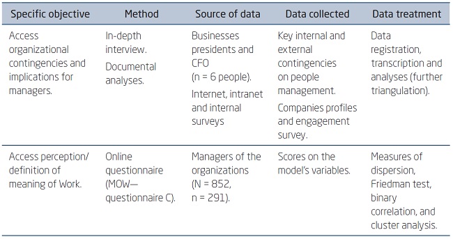 Principais aspectos metodológicos: A abordagem de pesquisa é de métodos mistos, usando sequencialmente, métodos qualitativos e quantitativos de investigação (entrevista, questionário e grupo focal). Considerando todas as fases, 316 gestores e executivos participaram da pesquisa. Variáveis do modelo Meaning of Work (MOW) fundamentaram o processo de coleta de dados. Para tratamento dos dados foram utilizadas estatística descritiva e inferencial e análise multivariada de dados.
