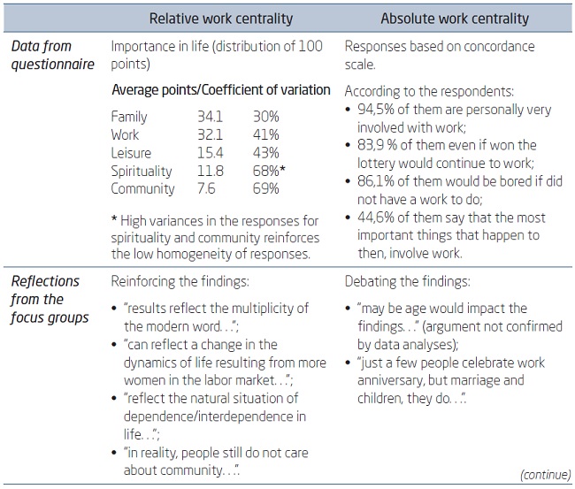 Valid results explore the reasons for working (Ruiz-Quintanilla & Claes, 2000). Descriptively, based on the average of the answers, there are two groups of results. Group one, with higher averages, consists of “the work provides me the income I need”, “the work itself is an interesting activity”, and “that satisfies me”. The second group, with much lower averages, includes “work allows me to have interesting contacts with others”, “helps me to serve the community”, “brings status and prestige”, and “keeps me occupied”. Despite the high dispersion in the answers in the questionnaires, in all focus groups, the participants agreed and had no new inputs. The central ideas of group one, income and interesting activity, represent the economic and the expressive results of the work, respectively (Carochinho, 2009; Ruiz-Quintanilla & Claes, 2000). This finding supports the research of Lemos and Cazavotti (2017) and Rodrigues et al. (2017). In addition, one argument of group two aligns with the contemporary source of meaning at work raised by Rohm and Lopes (2015)-interaction with people.
