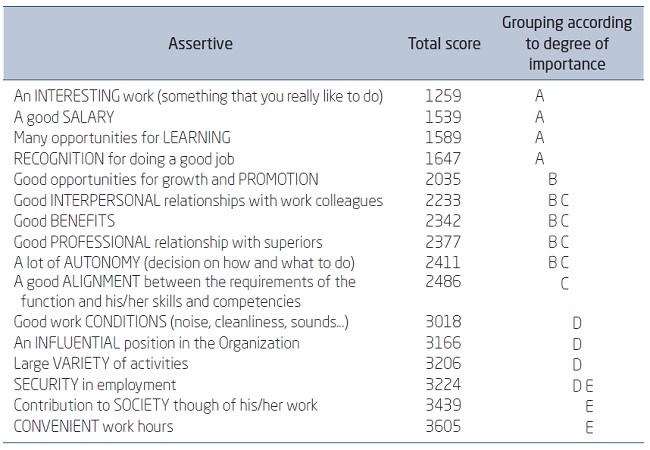 The values (objectives and preferences) elected by this group of professionals are aligned with the research on organizational people behavior (Crabtree, 2013; HayGroup, 2013; SHRM, 2017; Ulrich & Ulrich, 2011). They fill some gaps that disconnect professionals from their organizations (lack of recognition, unpleasant execution of the work, poor internal relationships and few opportunities).