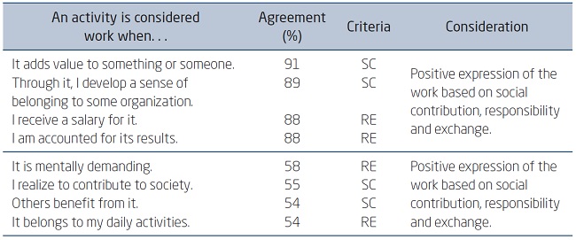 For this sample, all criteria are present in work identification with a clear positive expression of work. This perception is in line with Ruiz-Quintanilla and England’s studies, carried out from 1982 to 1991. The studies’ results varies from country to country, but always tends to be positive (the perception is more related to social contribution in eastern countries and more related to responsibility and exchange in western ones). In addition, as argued by Dourado et al. (2009), from an economic bias, in today’s society, work cannot be negative.