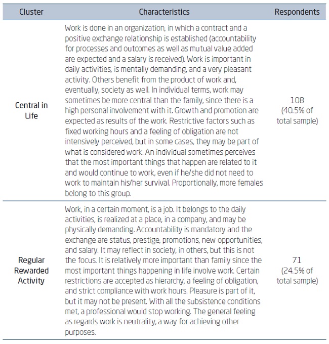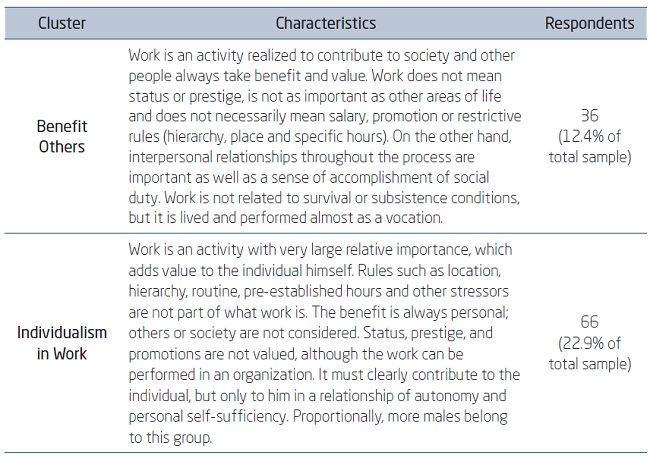 The cluster Individualism in Work did not find support in the seminal literature. It may represent a more contemporary vision of work and may be related to aspects of the competitive scenario (SHRM, 2014) and to characteristics of modernity like individuality, emancipation, and individualism at work, according to Bauman (2000). Also, this cluster may be aligned with new perspectives on a career that emphasizes autonomy and the “I entrepreneur”, the one who uses work to make life an adventure, projects himself into the future, and gives himself a form so as to become what he/she wishes to be (Lemos, 2013). The results reinforce multiple meanings and orientations of work discussed by the theory supporting this study.