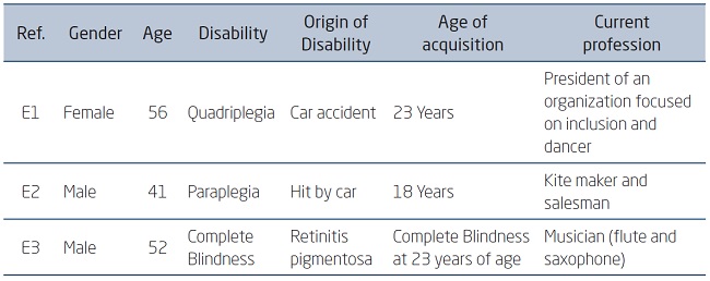 We accessed them through contacts with institutions renowned on the subject of inclusion, specialists on the subject and utilization of the Snowball method, in which an interviewee refers us to another with the desired profile. The interviews were guided by a semi-structured interview guide, with 26 questions separated into the following blocks: 1. Life trajectory; 2. Profession; 3. Current job; 4. The importance and meaning of work; 5. Labor outside the work environment; and 6. Professional identity. The interviews were done in person (in the work environments, public locations, or the interviewee's home), by Skype or telephone according to the interviewee's convenience, and last close to one hour. All interviews were recorded, with subject authorization, and later transcribed. Figure 3.1 synthesizes the interviewees' profiles.