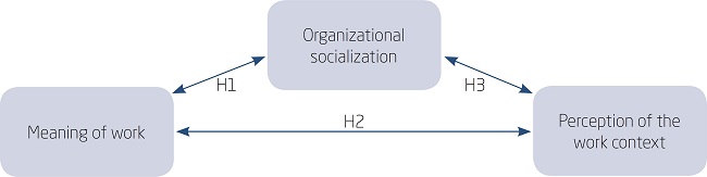 The theoretical framework proposes a situation in which organizational socialization has a mediating role in the relation between the meaning of work and the perception of working conditions. Subsequently, the methodological procedures of the research are presented through a quantitative approach. Finally, the results of the research and the final considerations are presented and analyzed.