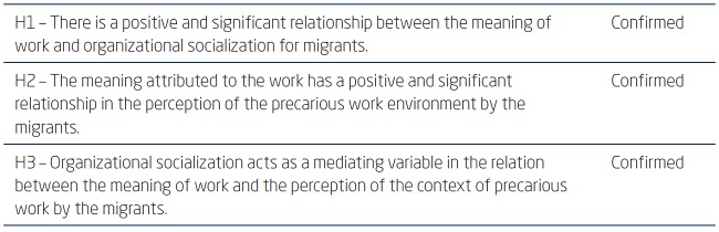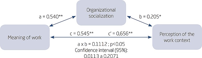 These results provide support for the confirmation of hypothesis 3 of this study, evidencing the mediating role of socialization in the perception of precarious work context, through the meaning attributed to work by migrants, suggesting that other organizational processes or practices can mediate this relation to make it complete.