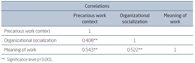 Adequacy statistics of the sample showed favorable results. For the data collected in this sample, the Cronbach's alpha presented a high reliability of the scales (0.891), the Bartlett sphericity test was significant (p <0.001) and the KMO showed adequacy with an index of 0.764. In relation to the association of variables, the correlation matrix (Figure 6.1) shows that the association between the meaning of work, organizational socialization and perception of the precarious work context occurs in a significant, positive and moderate way, showing that the individuals' perceptions evolve in the same direction. It can therefore be stated that the more meaningful the work is attributed by the migrant, the greater they perceive a precarious work context (r = 0.543, p <0.001). In addition, as organizational socialization increases, the meaning of the work for these individuals increases too (r = 0.522, p <0.001). As for the organizational socialization related to the perception of the precarious work context, it is noticed that there is a positive relation (r = 0.408, p <0.001).
