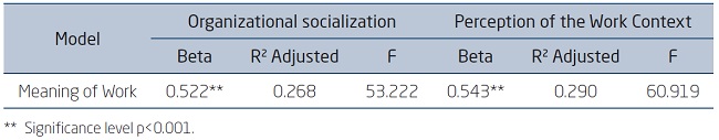 The initial hypothesis (H1) of this study predicted a positive relationship between the meaning of work and organizational socialization, the results pointed to statistical support. The results found in the model show that the meaning of the work has a positive and significant relationship with organizational socialization (β = 0.522, p <0.001), explaining 26.8% of this relation (R2 = 0.268). It is possible, therefore, to affirm that the hypothesis 1 is totally accepted by the relation established between these two variables: the more meaning migrants attribute to their work, the greater their socialization with the organization.