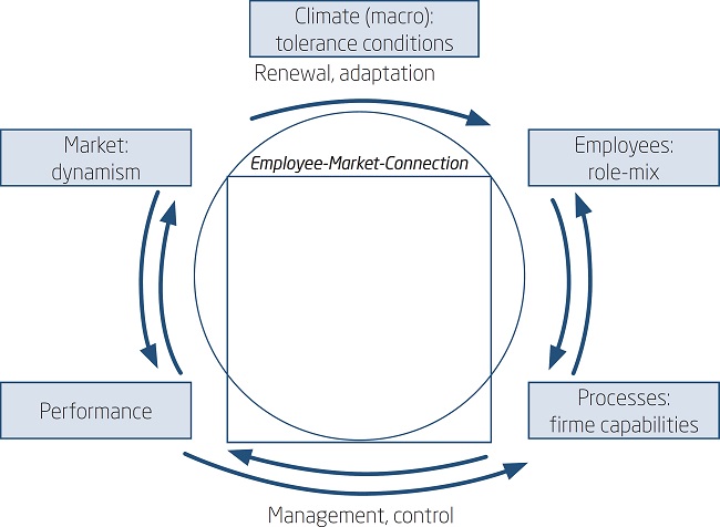 Just as species in an ecosystem can flourish when they are adapted to the environment, employees in an organization can deliver high performance when their roles are adapted to the market. In this analogy a role is a behavioral pattern, with associated competences, to fulfill the demands of the market. When it fits, growth and production will lead to survival and reproduction of the trait (Stearns & Hoekstra, 2005). In a similar conceptualization, the employee roles and related competences are adapted to the market. At an organizational level, this analogy implies that the employee community has to be connected to the market to attain a market-adapted role-mix. However, this connection between employees and markets has been neglected up to now in the debate about strategic fit between the neo-classical approach, or positioning school (Cyert & March, 1963; Porter, 1985; Williamson, 1979), and the Resource-Based View (Barney, 1991; Wernerfelt, 1984)/dynamic capabilities view (Stalk, Evans, & Shulman, 1992; Teece et al., 1997).