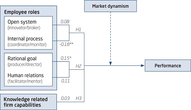 Findings: The employee role-mix is moderated by market dynamism: when market dynamism increases, the impact on performance of internal process roles decreases and the impact of rational goal roles increases. The results enrich the resource-based view with the employee-market-connection: the system is resilient, the roles adapt. A fit between market dynamism and employee roles is positively related to performance.